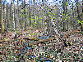 Hier mal ein Bild mit Wasserführung des "Falkenberger Grabens" auf der rechten Seite. Auf der linken Seite des Weges sickert auch im Hochsommer immer wieder Wasser aus dem Moor in das Bachbett. Durch den hohen Eisengehalt des Bodens färbt sich das Bachbett dann leicht rot. |