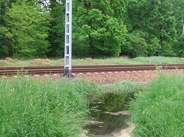 Hier an dieser Stelle reicht das Glieningmoor bis an die Bahnstrecke nach Frankfurt. Im Sommer und Herbst ist der westliche Uferbereich komplett mit Farnen und andere einjährigen Pflanzen zugewachsen. Dann ist die Wanderung am Moor ein echter Höllentripp. Der Wanderer sollte deshalb in der Zeit bis zur Bahnschranke an der Eisenbahnstrecke weiter wandern. |