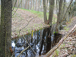 Vom "Demnitzer Mühlgraben" wandern Sie auf der Straße geradeaus weiter, die Steigung hinauf in Richtung der Autobahnbrücke. Nach etwa 150m befindet sich links ein Waldweg mit einer Schranke. In diesen biegen Sie links ab. Das Moor befindet sich zwischen der Wildheide und dem Tempelberger Forst. Auf dem Bild hat der Mühlgraben gerade sein Frühjahrshochwasser. Der Höchststand des Pegelmessers ist erreicht. |