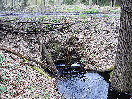 Etwa 200m nach der Schranke überqueren Sie den "Faulen Graben". Mit diesem Graben wurde versucht das Moor trocken zu legen und für die Weidwirtschaft zu nutzen. Zeitweiweise fällt der künsliche Abfluss des Moores auch schon mal trocken. Sie überqueren den Bach und wandern gradeaus weiter. |