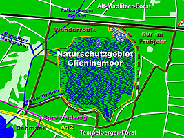 Die Umwanderung des 150 ha umfassenden Glieningmoors ist zu jeder Jahreszeit zu empfehlen. Im Sommer sollte man jedoch auf keinen Fall von der Eisenbahnstrecke direkt am Moorufer entlang bis an das Südende wandern. Diese Strecke ist nur im Frühjahr vor der Vegetationsphase problemlos möglich. Im Sommer ist dieses Stück ein Höllentrip durch Farne und anderen Bewuchs. |